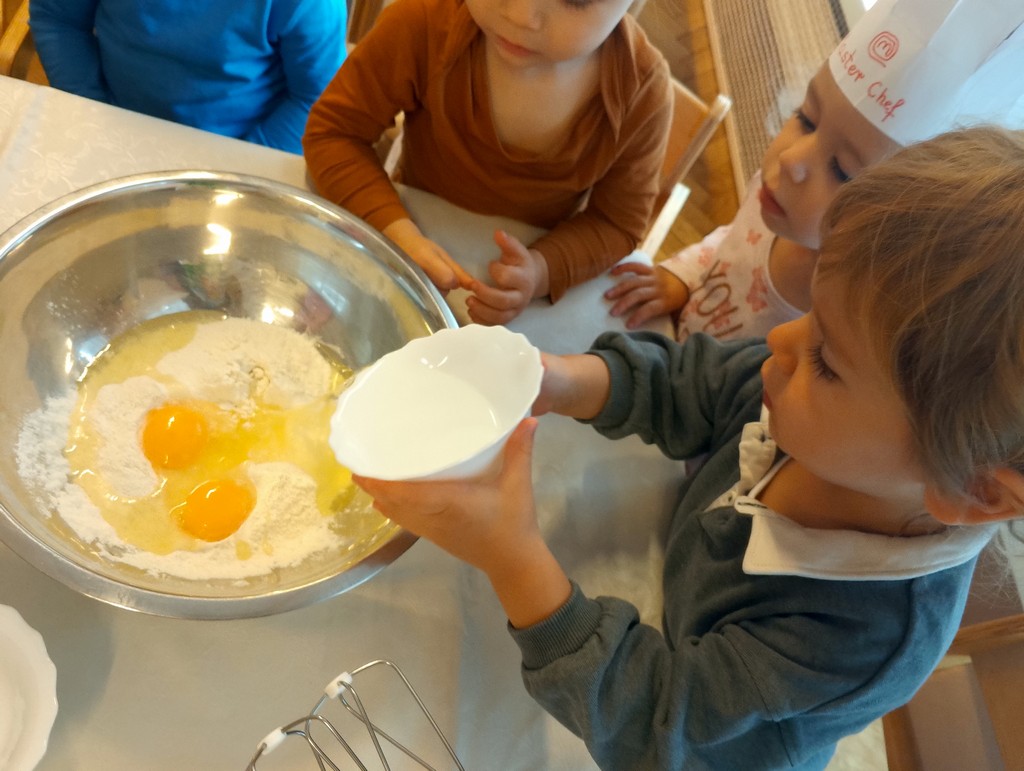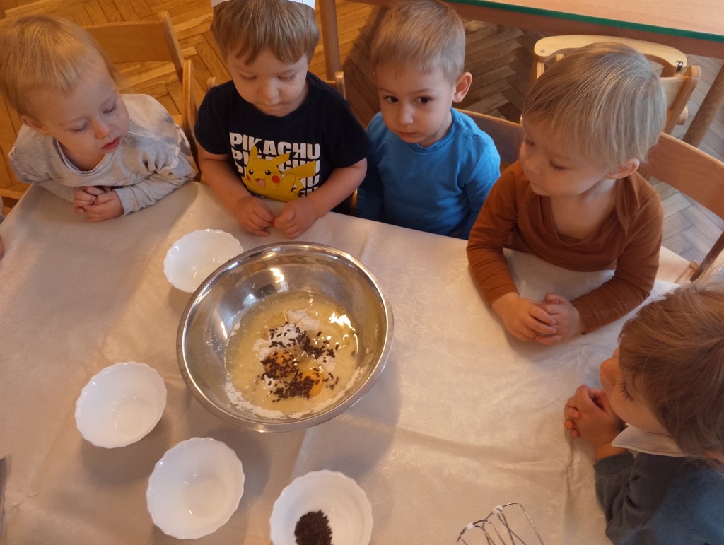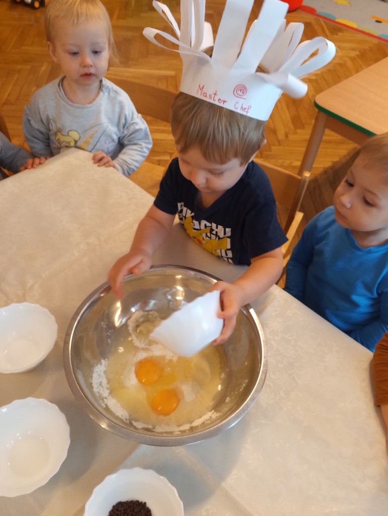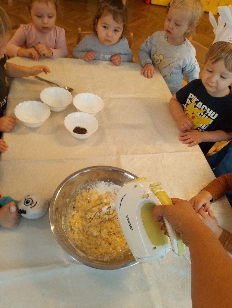 Dzieci były bardzo zainteresowane i aktywne. Pomagały odmierzać składniki, mieszały ciasto, wlewały do foremek i dekorowały płatkami czekolady. Następnie wszyscy nie mogli się doczekać efektu ich pracy. Gdy muffinki się upiekły nasi Milusińscy zjedli je na podwieczorek.