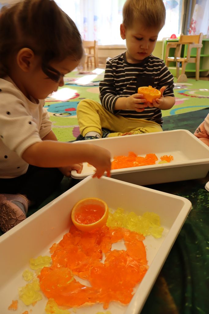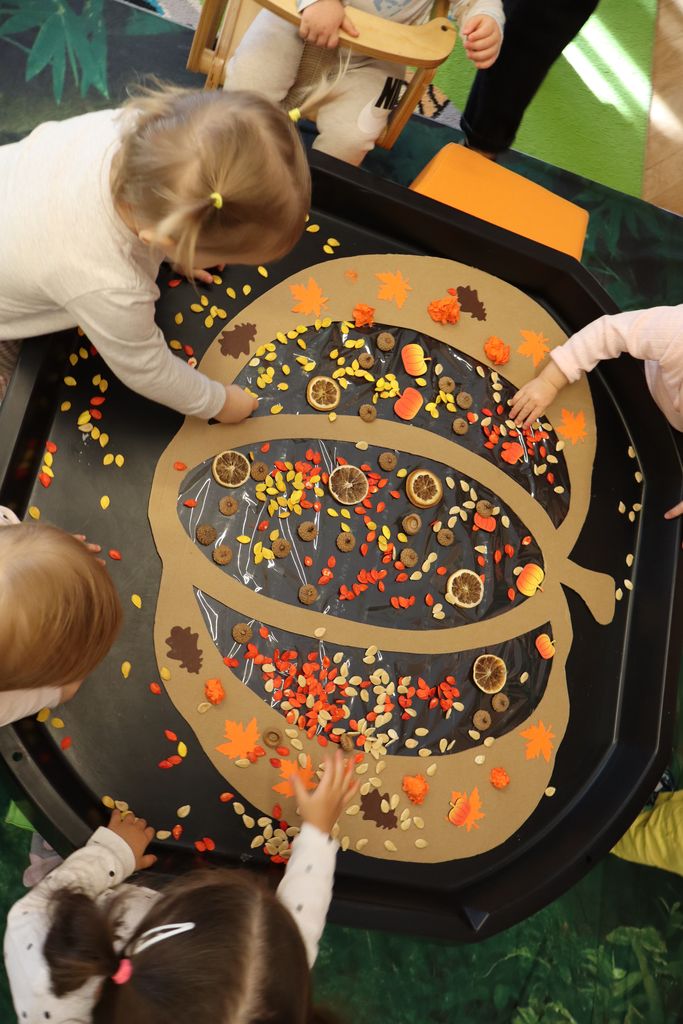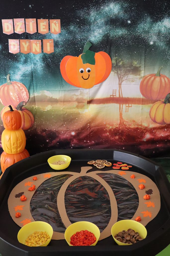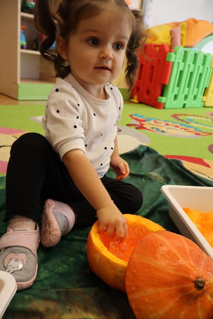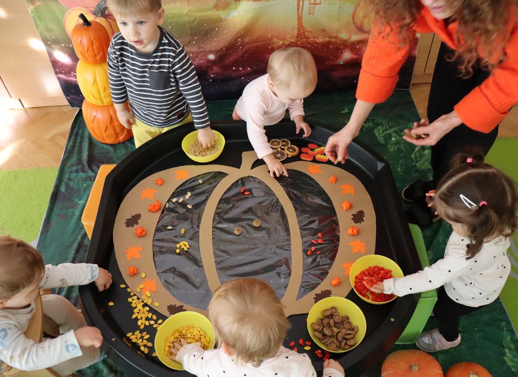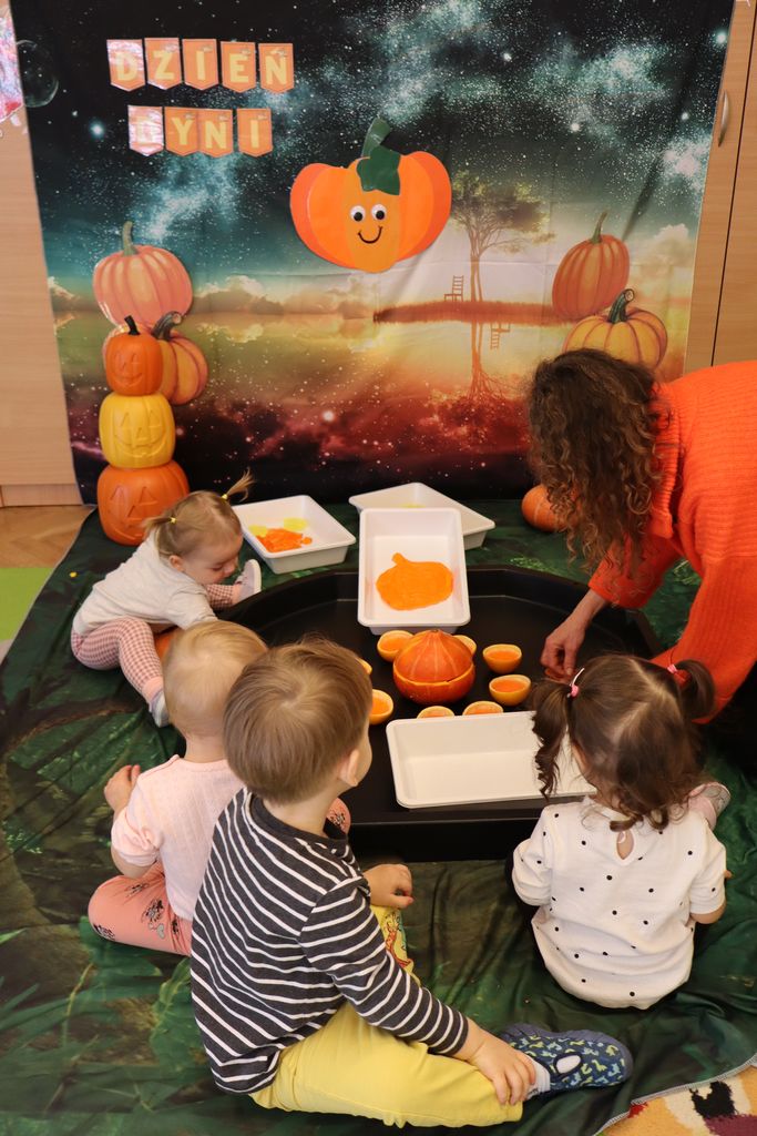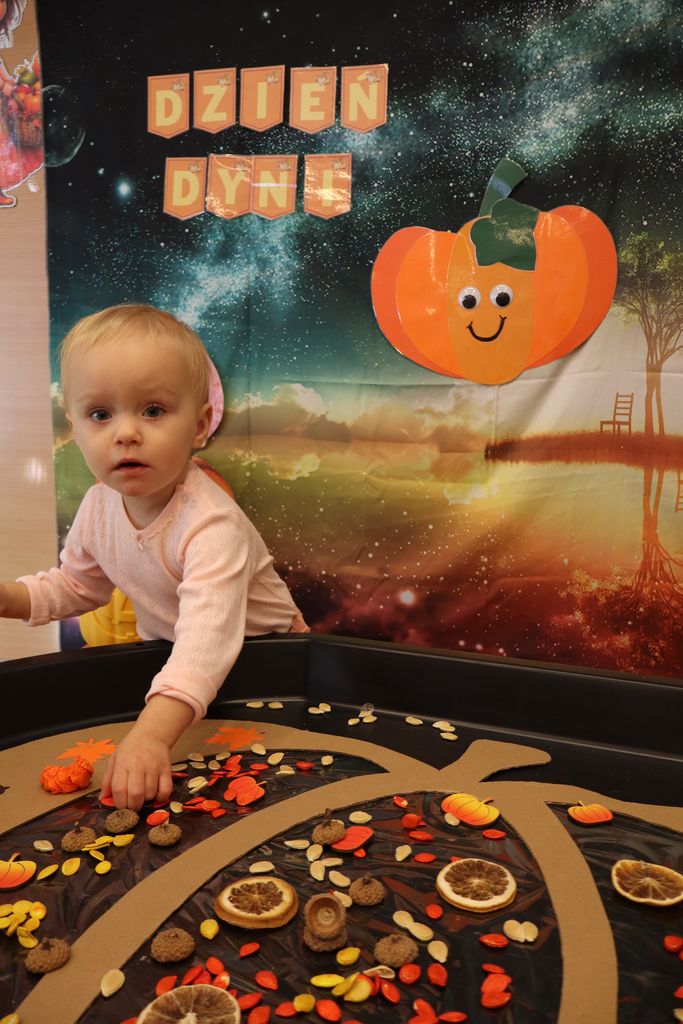 Obchodzony końcem października Dzień Dyni to doskonała okazja do kreatywnych zajęć z dziećmi. Nasi żłobkowicze podczas wspólnej zabawy wyklejali szablon dyni kolorowymi pestkami, czapeczkami żołędzi, suszonymi plasterkami cytryn. Zajęcia z wykorzystaniem naturalnych składników takich jak ziarna, pestki, suszone owoce rozwijają motorykę małą, usprawniają koncentrację a także stymulują uwagę małego dziecka. W dalszej części naszych dyniowych aktywności stymulowaliśmy nasze zmysły wzroku, węchu i smaku podczas zabaw z „galaretkowymi dyniami”. Małe rączki świetnie się bawiły dotykając, ugniatając i badając konsystencje. Był to dzień pełen kolorów, zapachu i wspaniałej zabawy.
