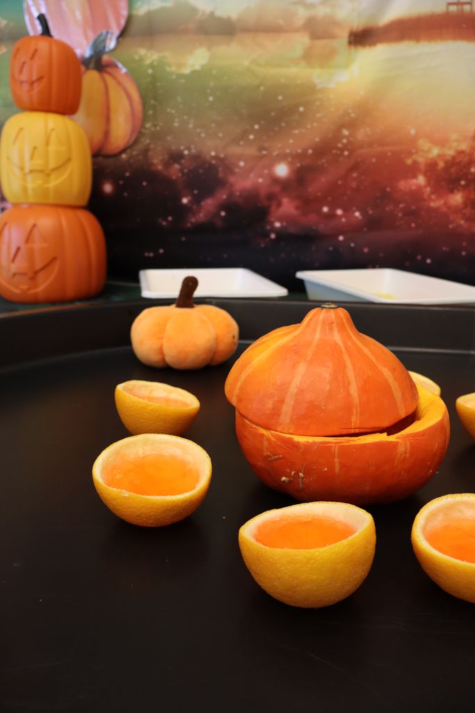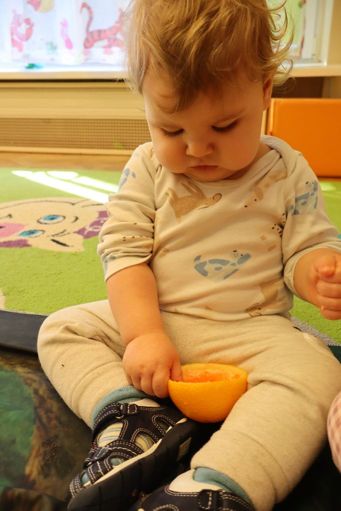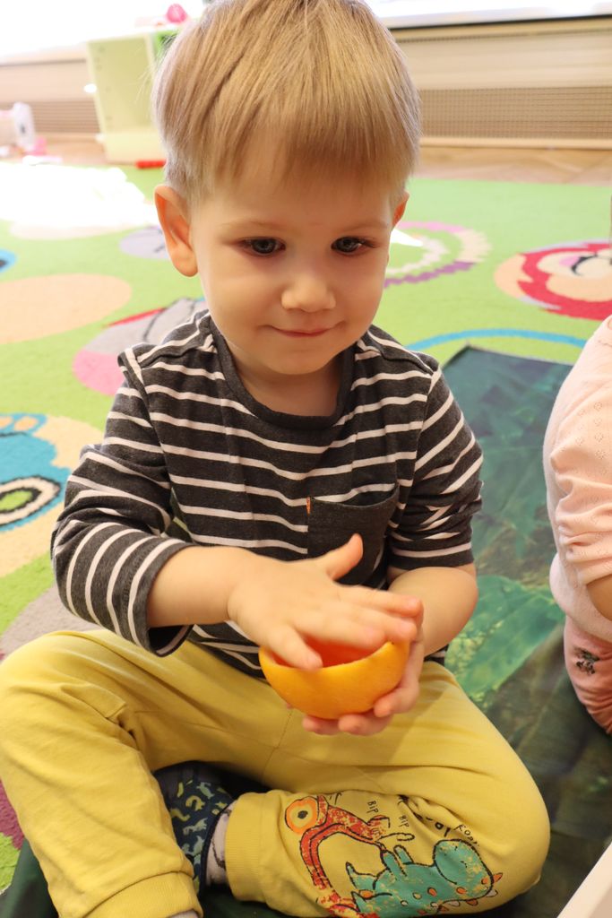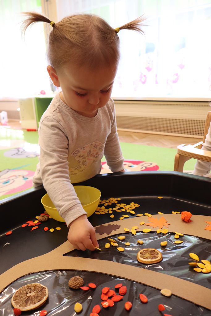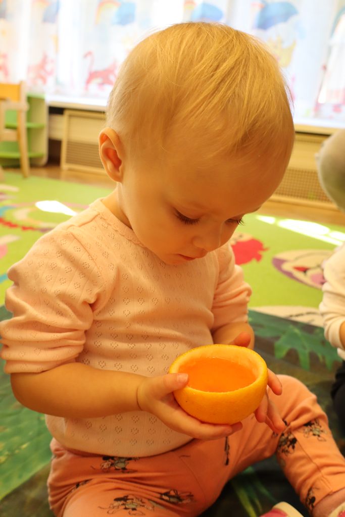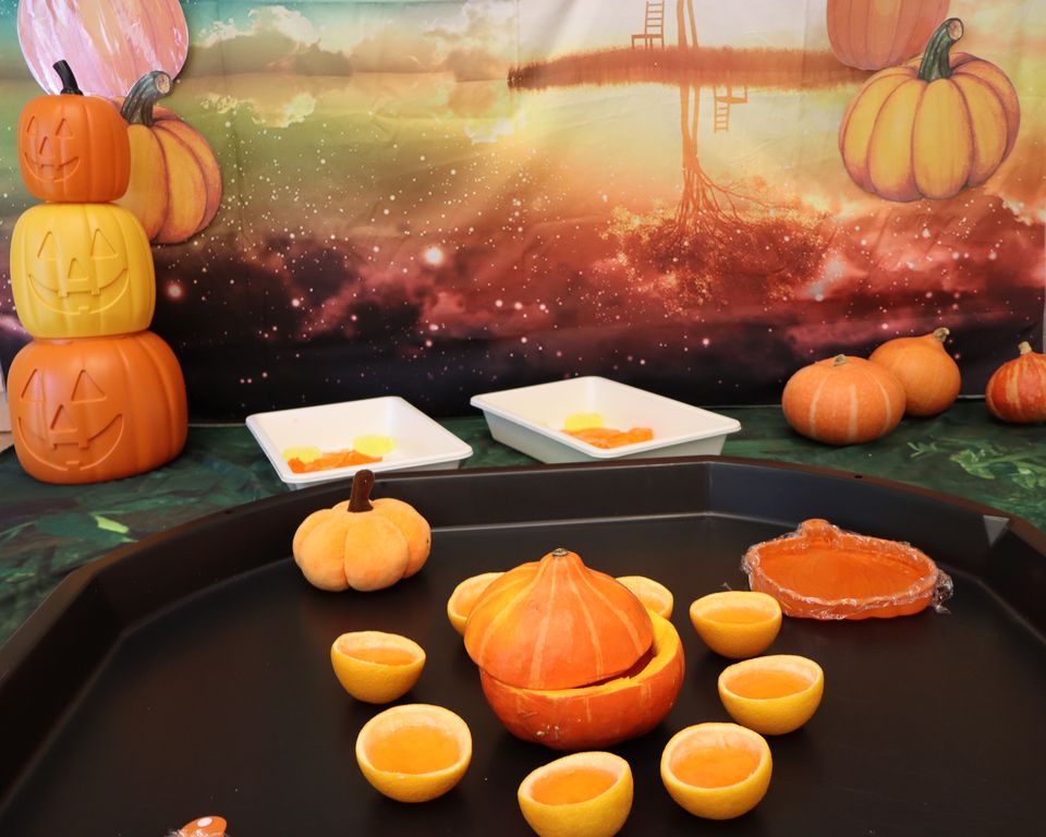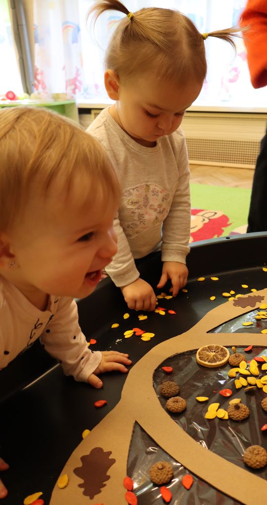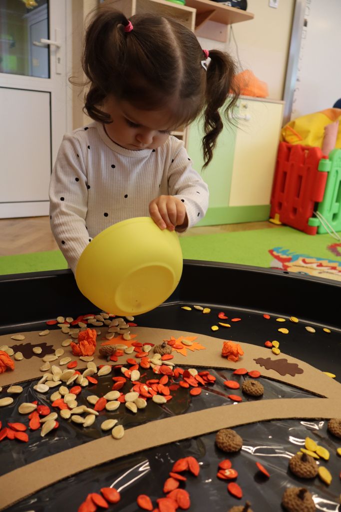 Obchodzony końcem października Dzień Dyni to doskonała okazja do kreatywnych zajęć z dziećmi. Nasi żłobkowicze podczas wspólnej zabawy wyklejali szablon dyni kolorowymi pestkami, czapeczkami żołędzi, suszonymi plasterkami cytryn. Zajęcia z wykorzystaniem naturalnych składników takich jak ziarna, pestki, suszone owoce rozwijają motorykę małą, usprawniają koncentrację a także stymulują uwagę małego dziecka. W dalszej części naszych dyniowych aktywności stymulowaliśmy nasze zmysły wzroku, węchu i smaku podczas zabaw z „galaretkowymi dyniami”. Małe rączki świetnie się bawiły dotykając, ugniatając i badając konsystencje. Był to dzień pełen kolorów, zapachu i wspaniałej zabawy.