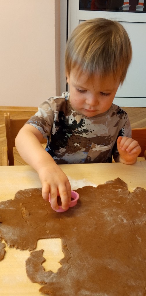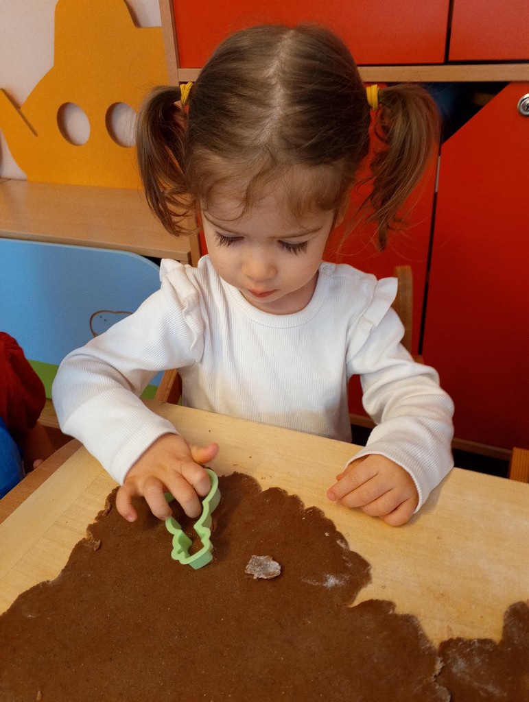 Maluszki bardzo chętnie wałkowały ciasto, wycinały pierniki i układały je na blasze. Były to bardzo kreatywne zajęcia. Wszystkie dzieci były niesamowicie szczęśliwe. Swoje wypieki zjadły że smakiem na podwieczorek.