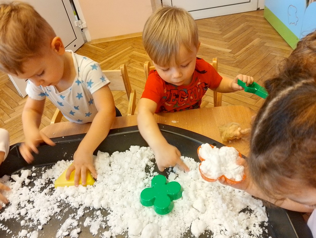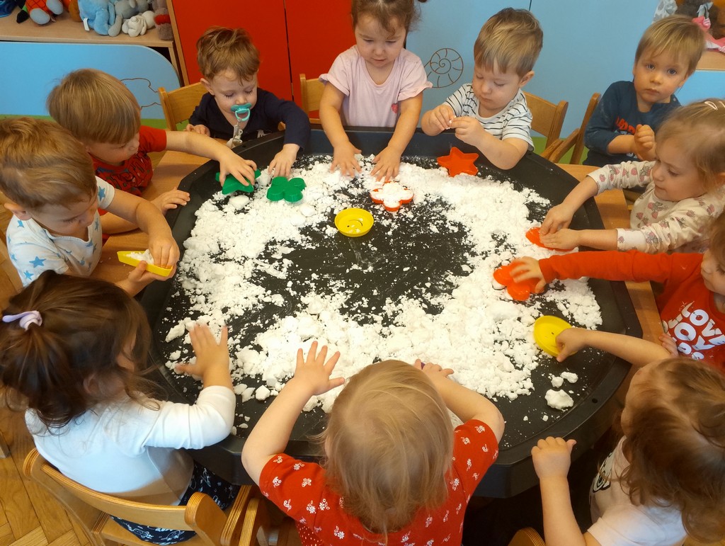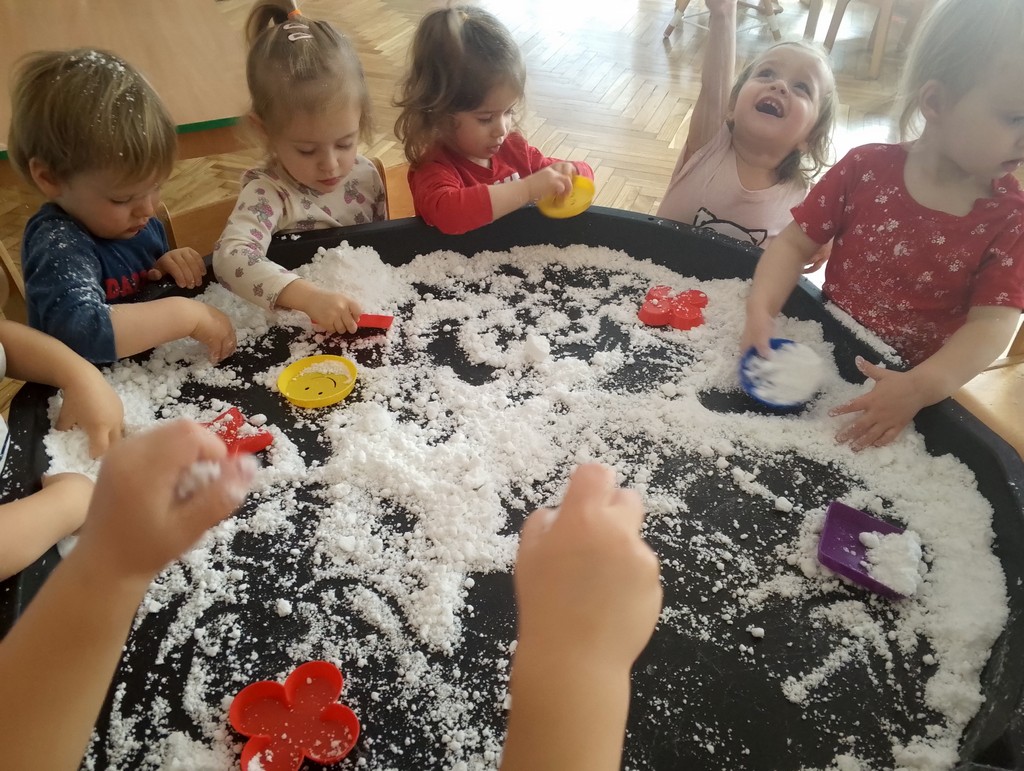 Brakuje mam go za oknem dlatego Panie przygotowały dzieciom sztuczny śnieg z mąki ziemniaczanej. Nasi Milusińscy mieli świetna zabawę, rozbudzającą wyobraźnię i zmysły.