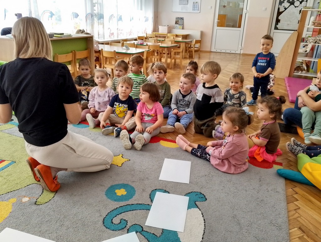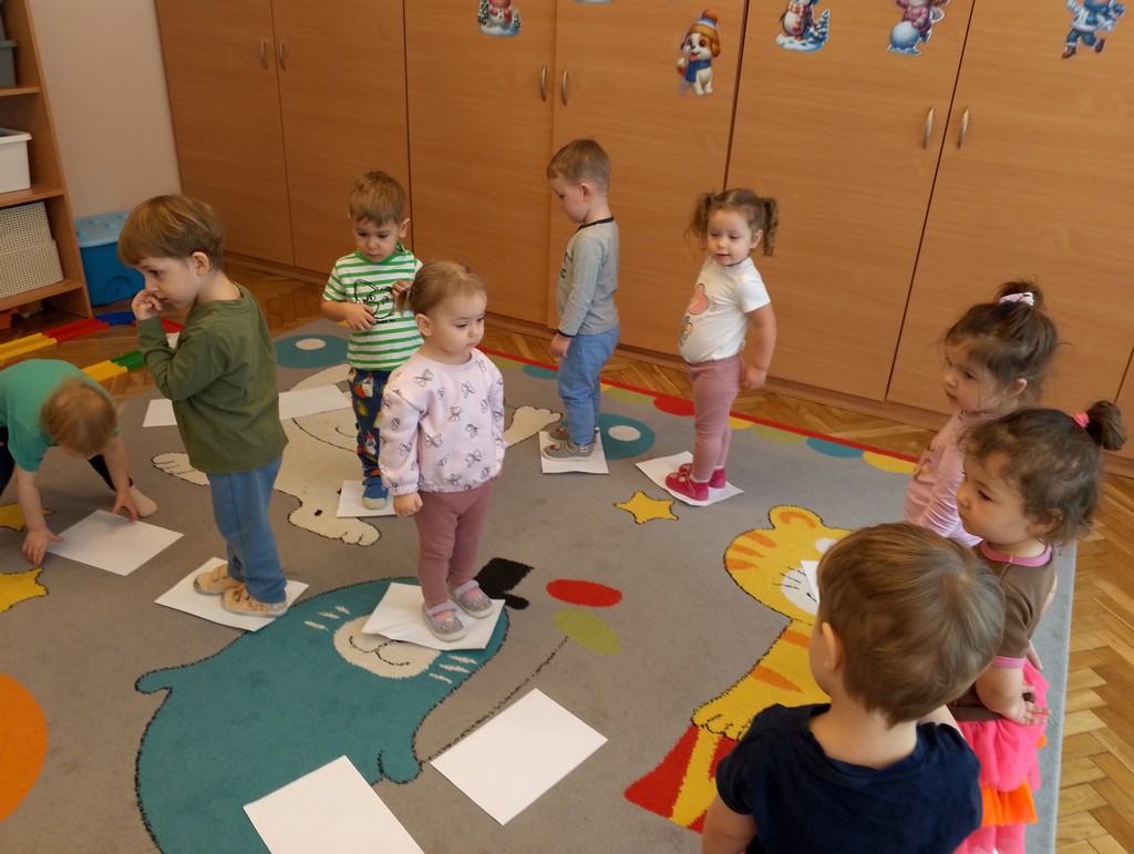 Podczas ostatnich zajęć nasze Motylki uprawniały motorykę dużą i małą. Panie zaproponowały dzieciom pląsanie w rytm muzyki po kartkach papieru ułożonych na dywanie. Maluszki maszerowały, skakały, stały na jednej nodze. W dalszej części zajęć dzieci ćwiczyły swoje małe rączki robiąc z papieru kulki i trafiając nimi do pojemnika. Jednak największą frajdę miały robiąc z papieru śnieg, rozrywając go na malutkie kawałeczki. Były to bardzo kreatywne i napewno wesołe zabawy.