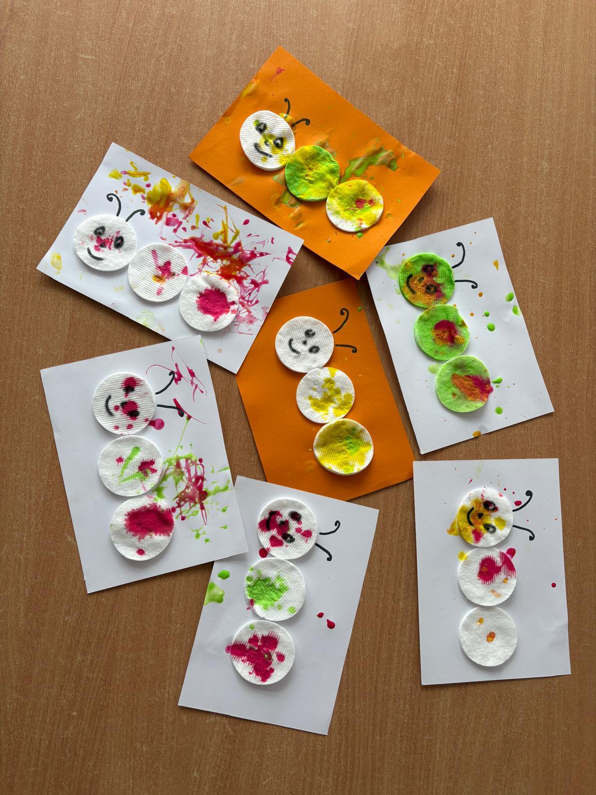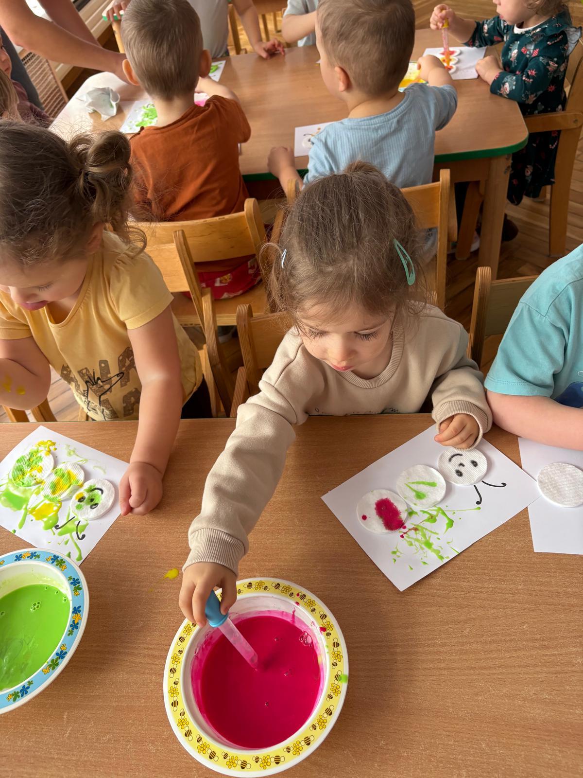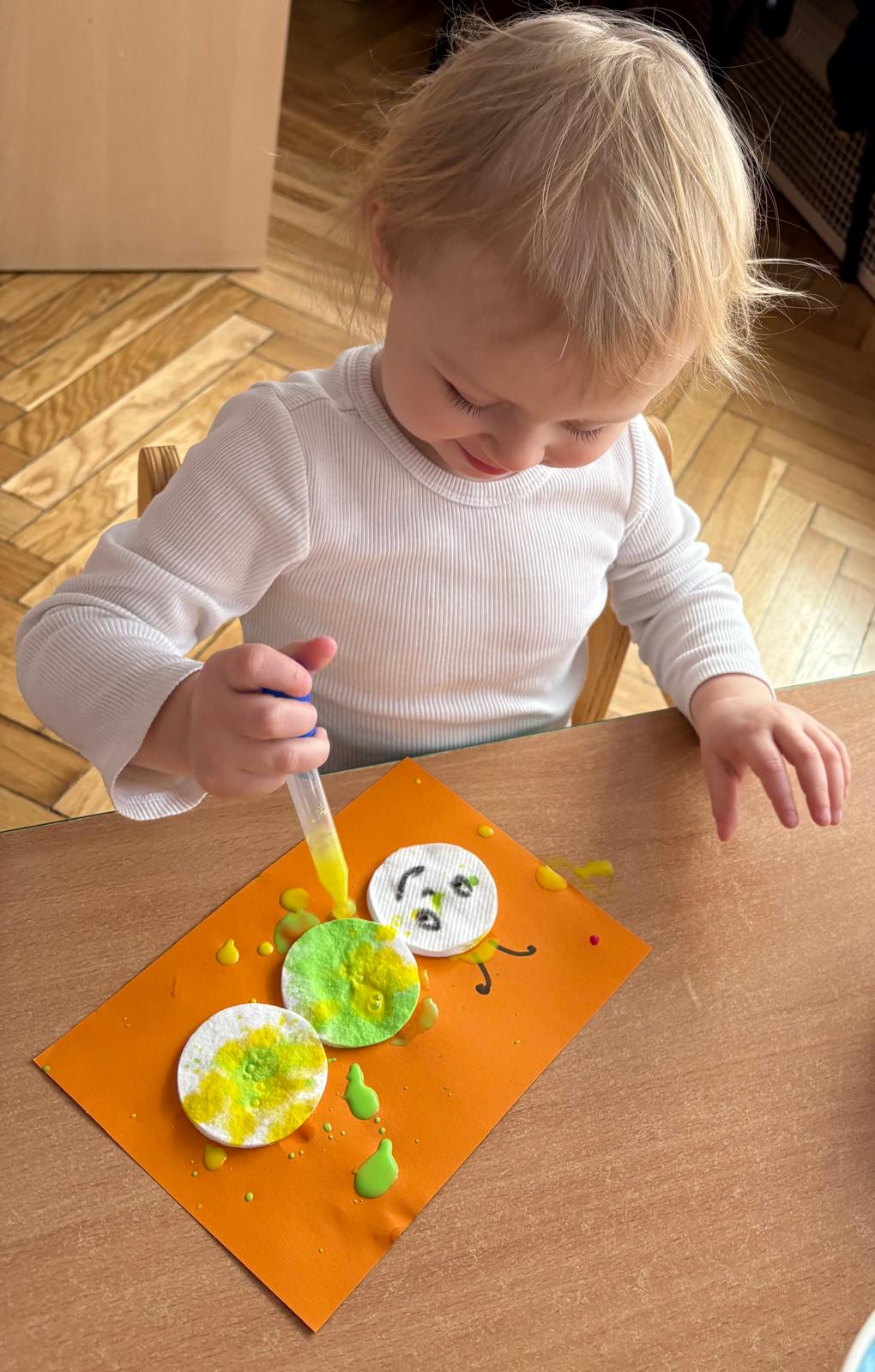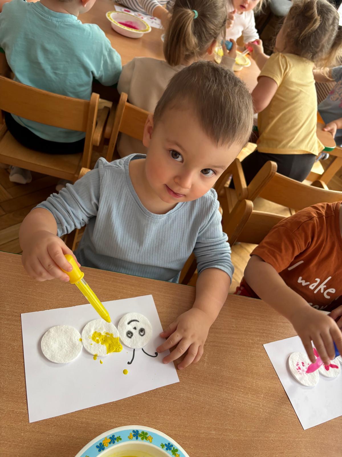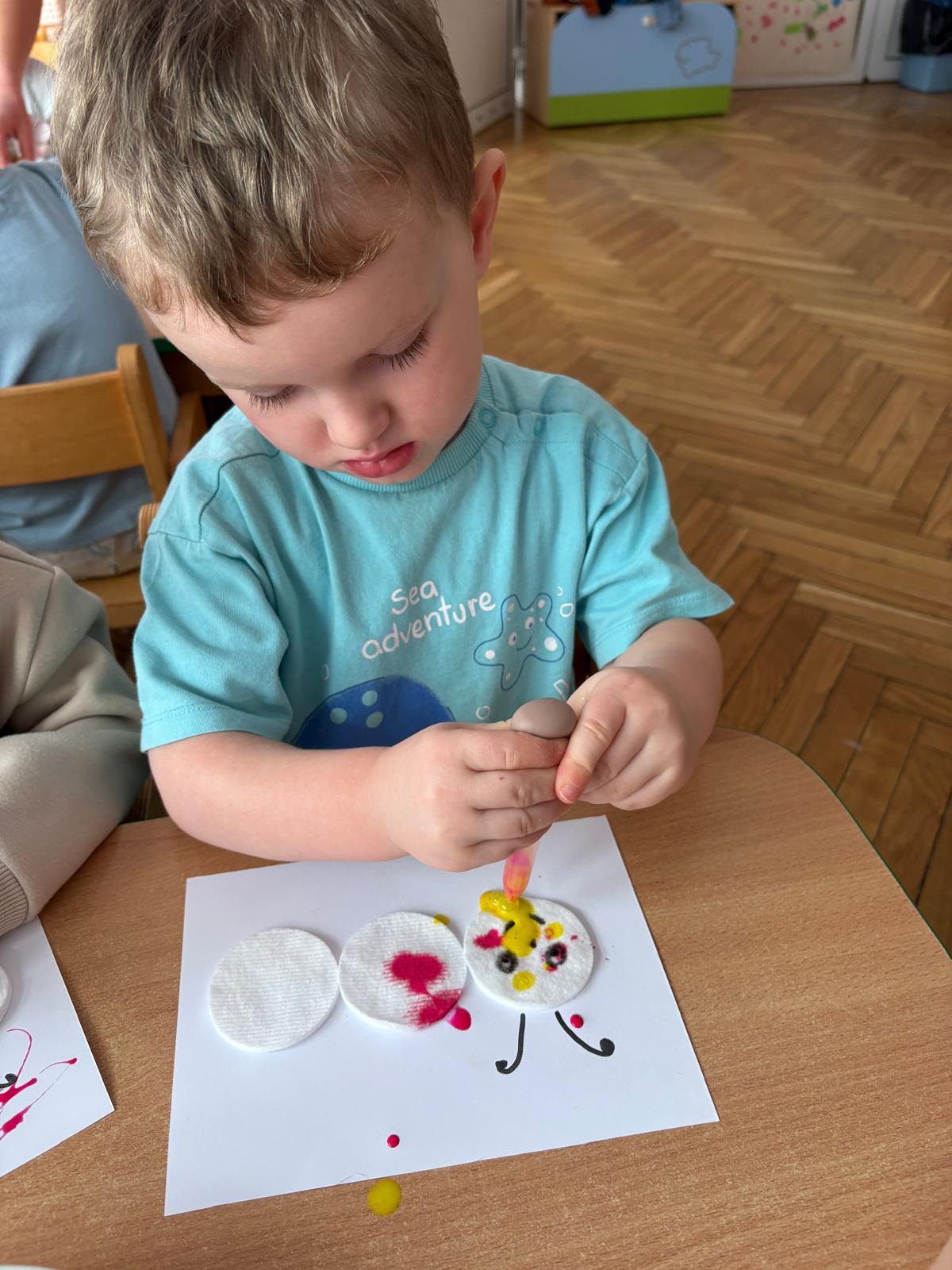 W grupie Motylki Miejskiego Żłobka nr 1 w Gorlicach odbyły się kolejne ciekawe zajęcia plastyczne, tym razem z wykorzystaniem pipet. Nasze Maluszki ćwiczyły swoje małe rączki napełniając pipety farbą i malując metoda kropelkową wacikowe robaczki. Powstały barwne prace.