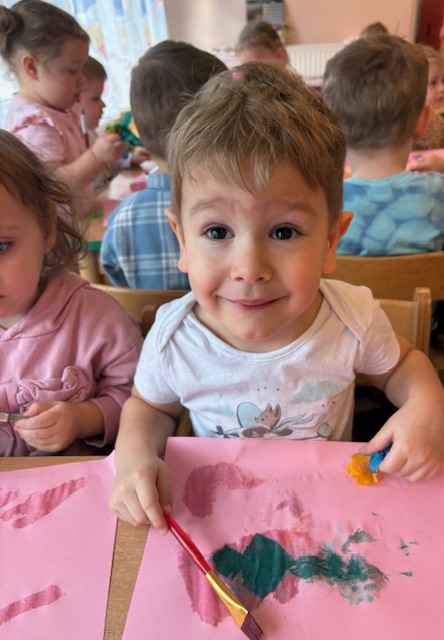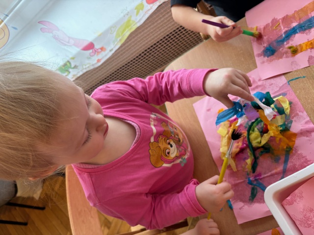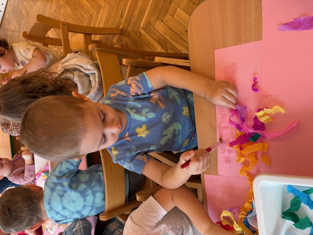 Dzieci w Miejskim Żłobku nr 1 w grupie Motylki poznawały technikę malowania bibułą. Jest to doskonała sensoryczna zabawa, polegająca na nakładaniu kawałków mokrej kolorowej bibuły na kartkę. Dzieci podczas tych zajęć tworzą tła, obserwują mieszanie barw i rozwijają motorykę małą.