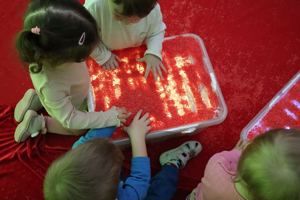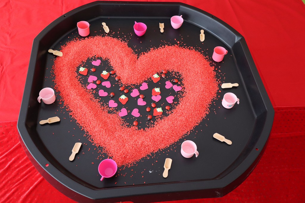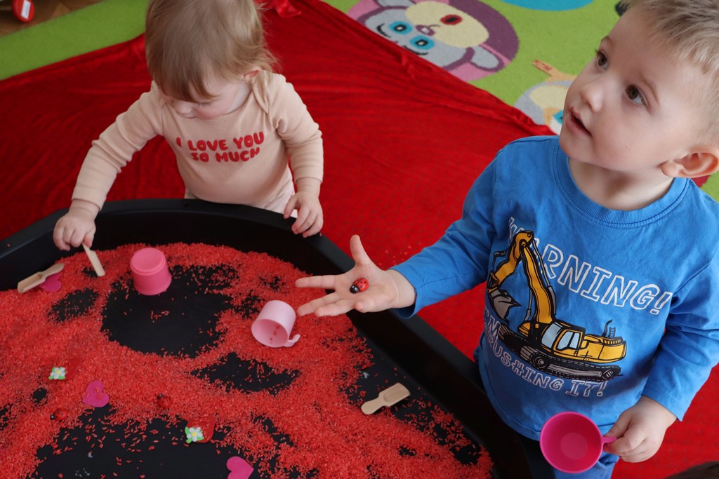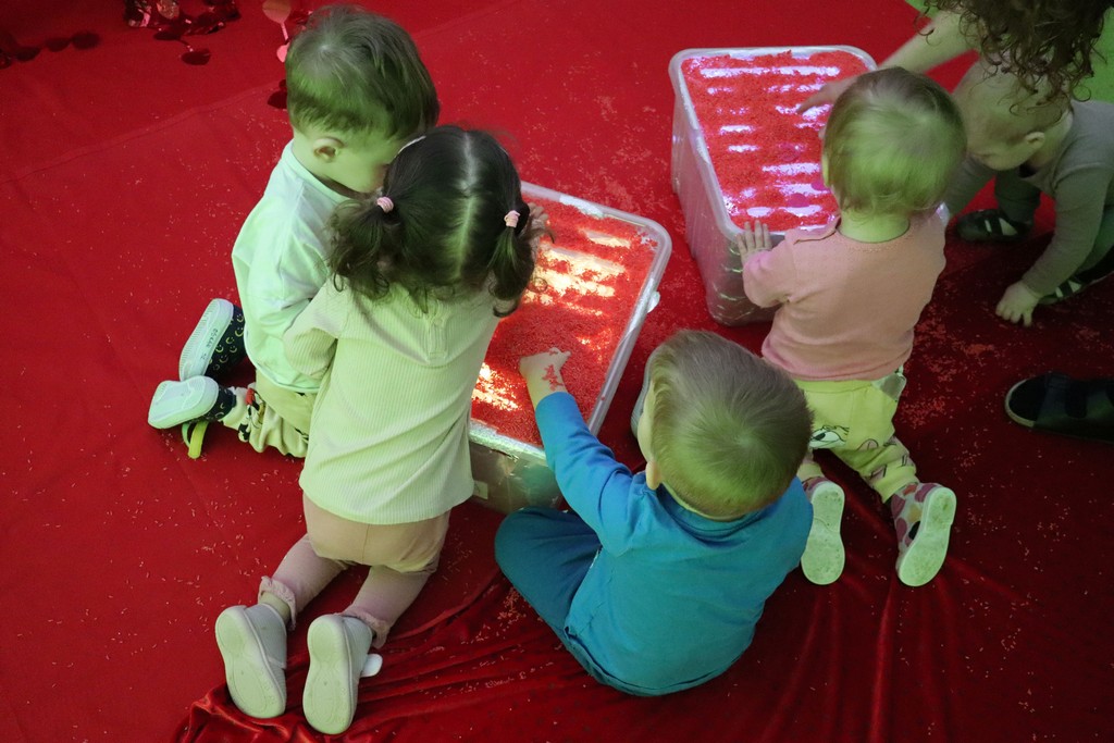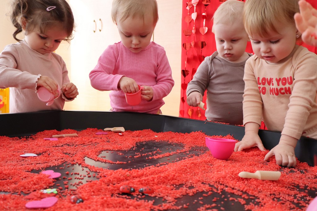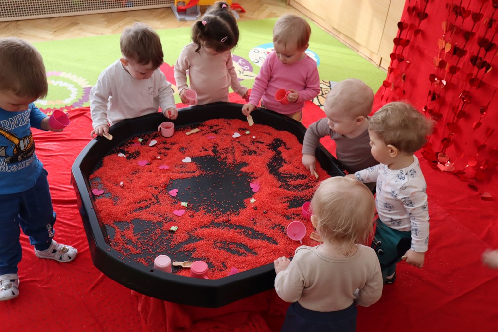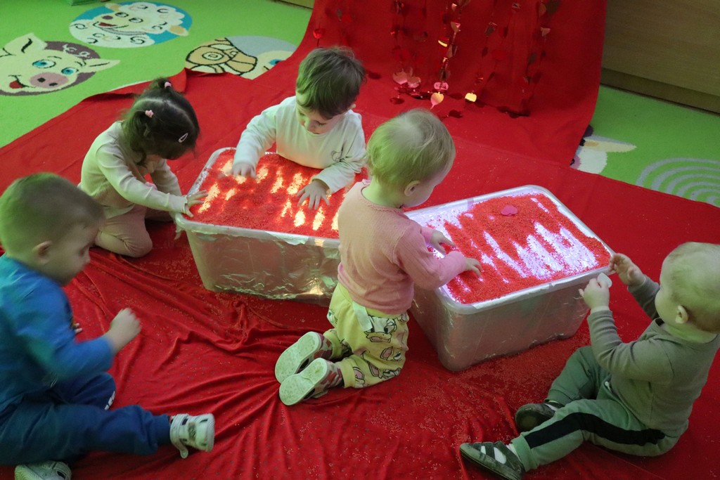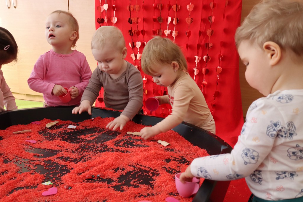 Dzieci z grupy Pszczółki ze Żłobka nr 1 obchodziły je 14 lutego. Z ogromnycm zaangażowaniem szukały serduszek ukrytych w czerwonym ryżu, naklejały serduszkowe naklejki na wycięte z papieru serca. Najbardziej podobało się dzieciom rysowanie paluszkami w ryżu wysypanym na podświetlone pudełka.