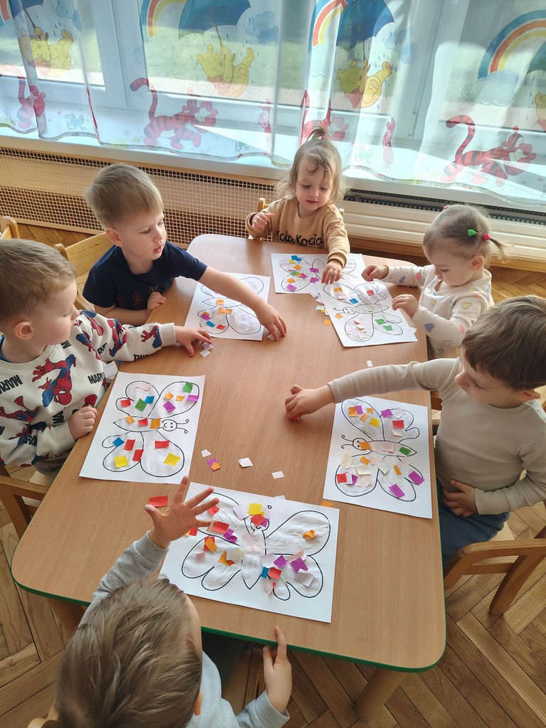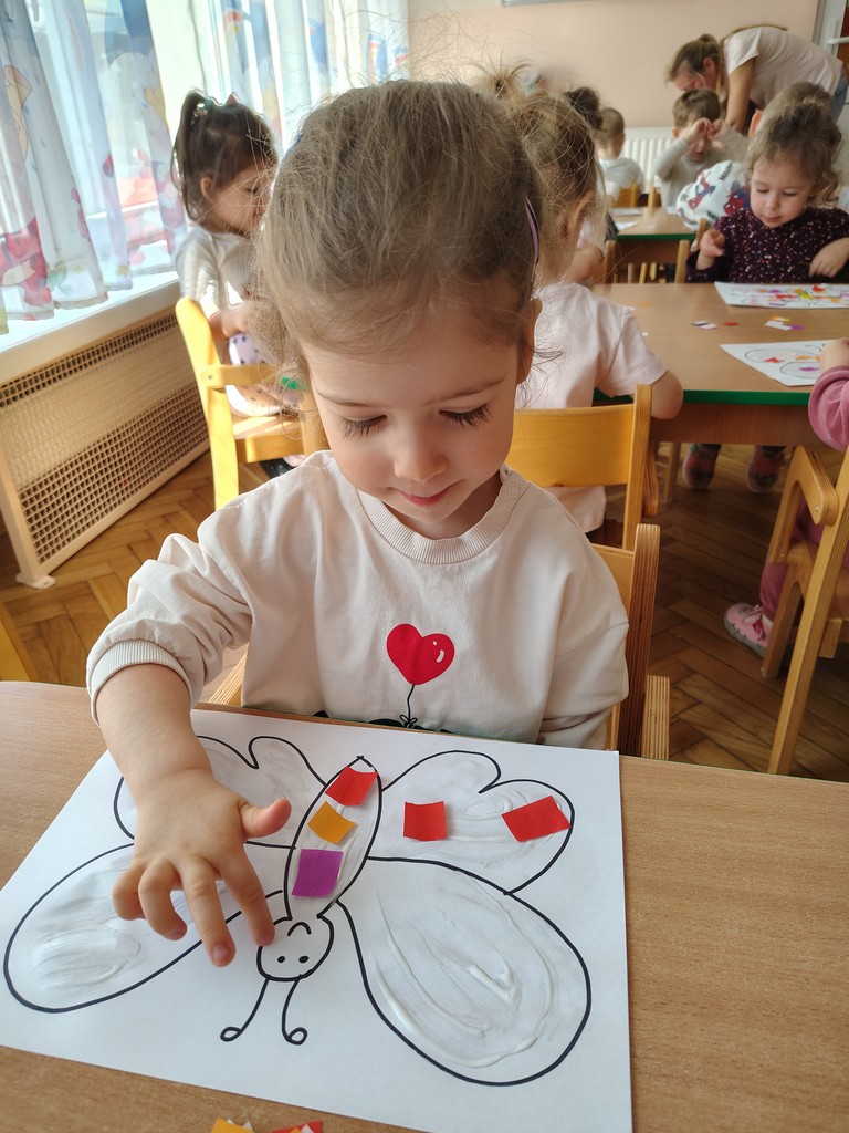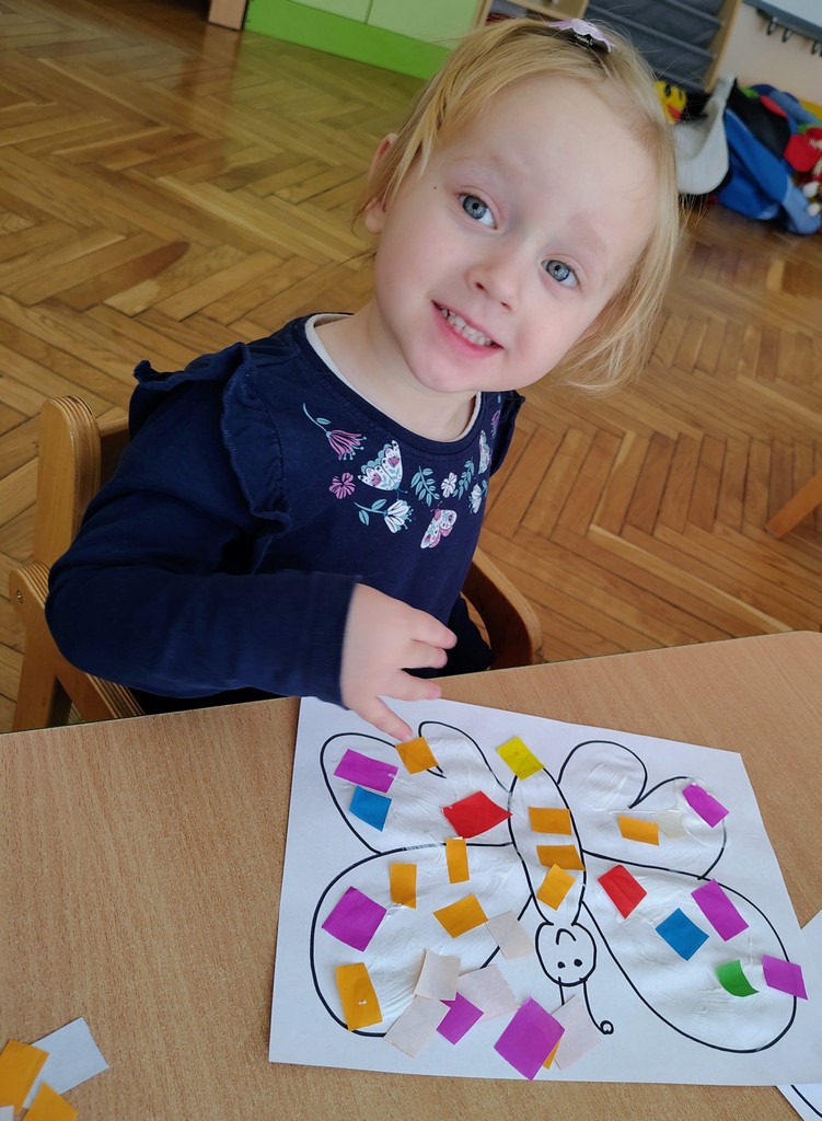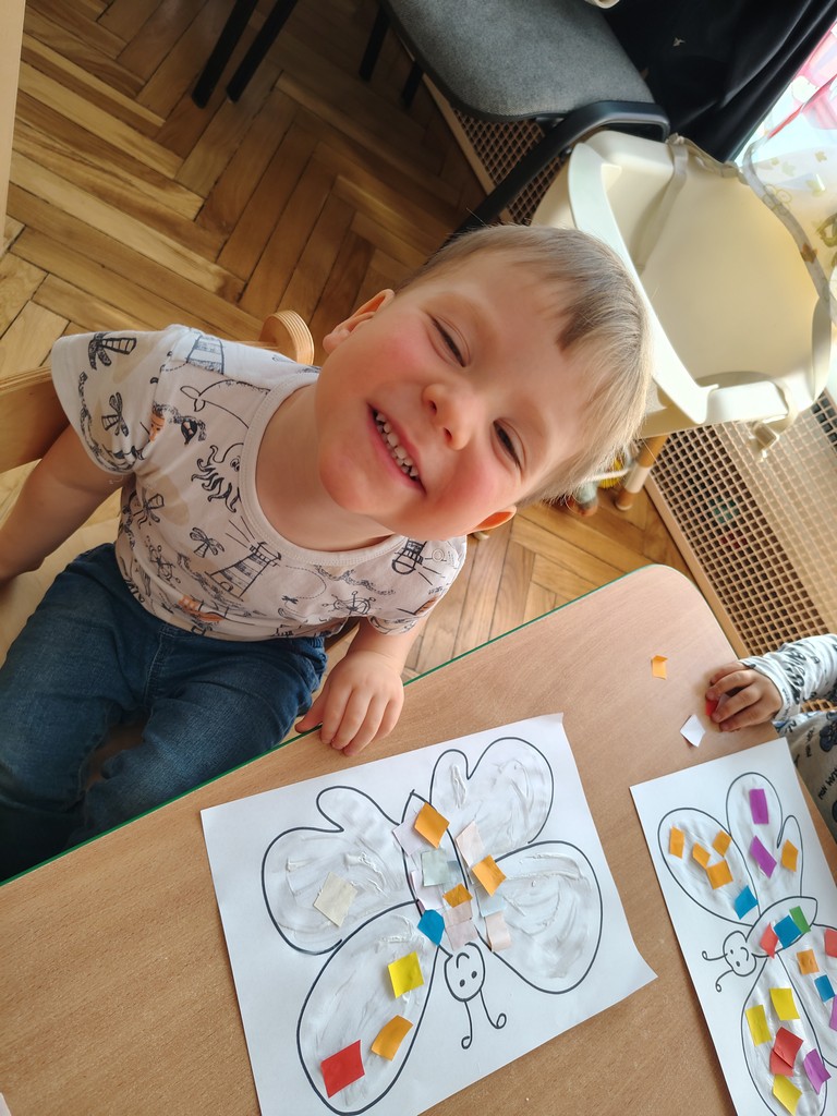 Dzieci z grupy Motylki Miejskiego Żłobka nr 1 w Gorlicach wykonały pracę plastyczną - wiosennego kolorowego motylka. Przyklejały na kartkę kawałeczki kolorowego papieru. Powstały piękne prace. Dzieci uwielbiają tego typu zajęcia. Rozwijają one wyobraźnię i zmysły oraz ćwiczą motorykę małą naszych Maluchów.