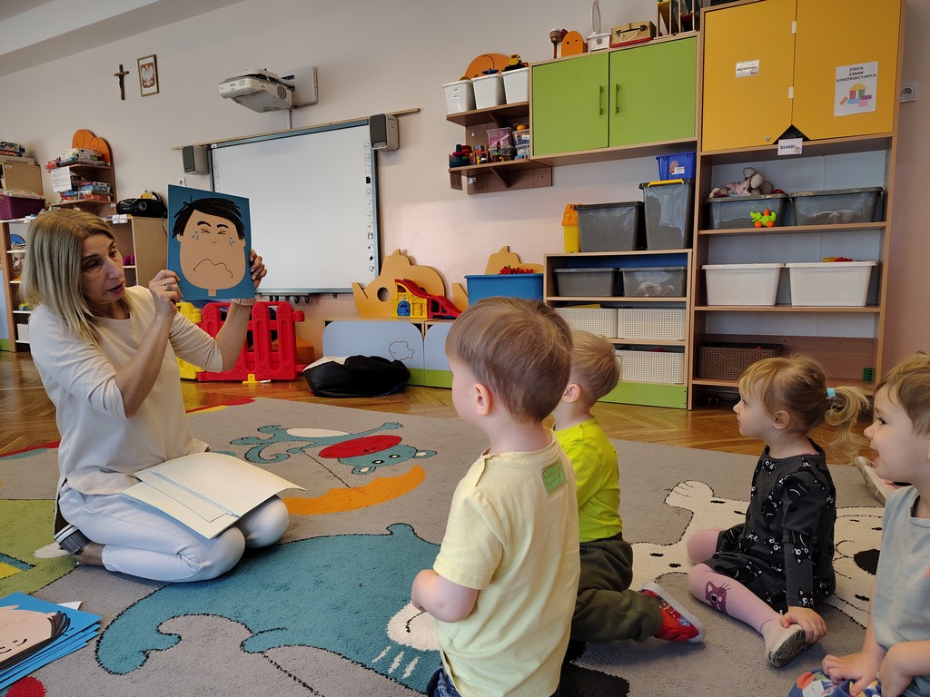Drukuj Powrót do poprzedniej strony Zajęcia z emocji w Motylkach 24.03.2026 8:27 Treść W grupie Motylki odbyły się zajęcia podczas których dzieci poznawały emocje: radość, smutek, gniew, strach, złość, zdziwienie. Dzieci nazywały emocje na kartach a następnie starały się je naśladować.