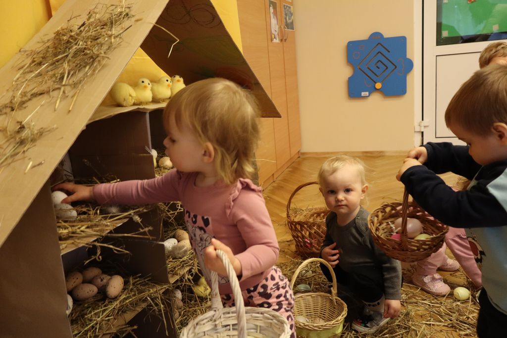 Dzieci z grupy „Pszczółki” zapoznawały się w ostatnim tygodniu z tematyką Świąt Wielkanocnych. Najmłodsi wyruszyli z koszyczkami z poszukiwaniu wielkanocnych jajeczek.  W naszej sali ciocie przygotowały piękny kurnik z wykorzystaniem ekologicznych materiałów, a także tor po którym dzieci puszczały kolorowe jajeczka, ćwicząc motorykę małą i bawiąc się przy tym doskonale.